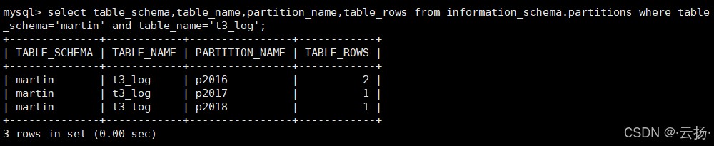 select table_schema, -- 数据库名 table_name, -- 表名 partition_name,-- 分区名 table_rows -- 分区行数 from information_schema.partitions where table_schema='martin' and table_name='t3_log';