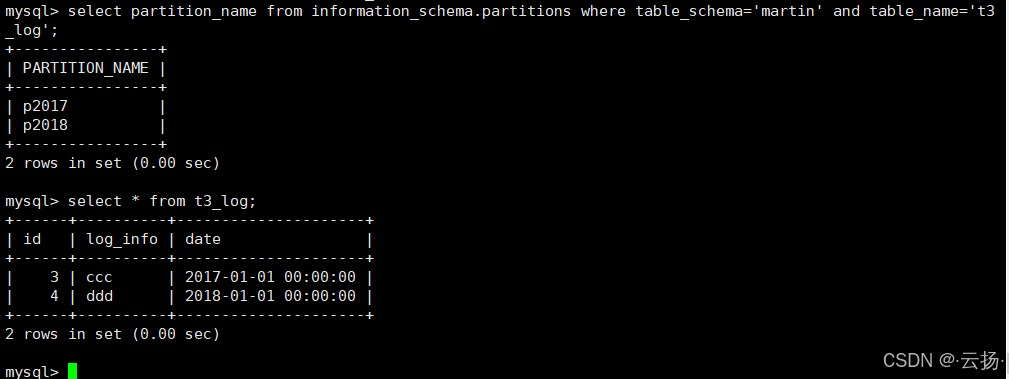 -- 查看分区列表(p2016已消失) select partition_name from information_schema.partitions where table_schema='martin' and table_name='t3_log'; -- 查询全表数据(2016年数据已删除) select * from t3_log; -- 仅返回2017、2018年数据