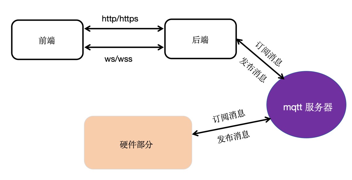 该图为完整的mqtt项目结构图。其中mqtt服务器部分可以用官方提供的公共的服务器,也可以在自己的服务器上搭建,只需要在后端配置文件添加mqtt服务器ip地址等相关信息。