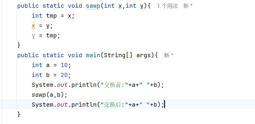 在swap的方法内部,x和y的值确实被交换了.但这只是交换了x和y的副本值,而不是main方法中a和b的值.当swap方法执行完毕后,x和y的生命周期结束,他们的值不会影响到main方法中的a和b