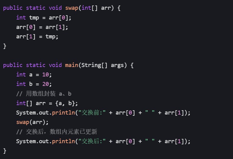 基本类型本身无法直接通过方法修改外部变量,但可以用数组(引用类型)封装,通过修改数组元素实现交换: