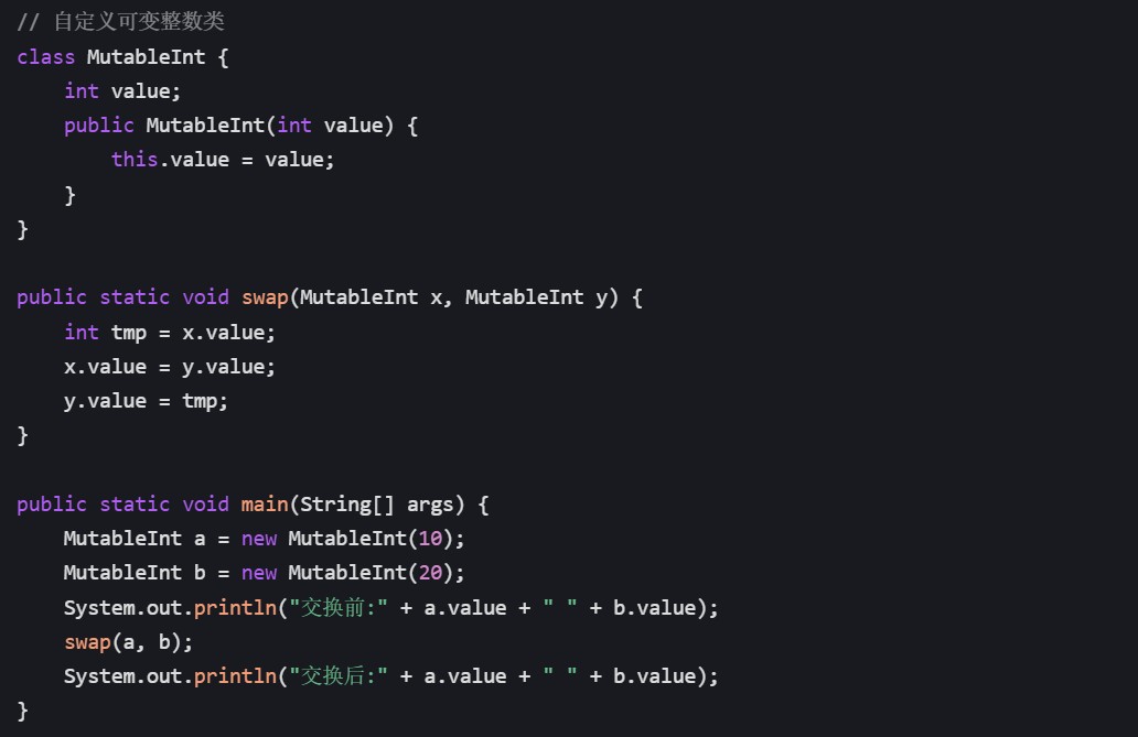 总结:最简洁的方式是用数组封装基本类型(方法 1),利用引用传递修改内部元素;若追求更面向对象,可自定义可变包装类(方法 2);简单场景也可直接返回交换结果(方法 3)。