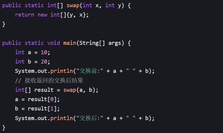 方法 3:返回交换后的结果(无需修改外部变量,直接返回新值)