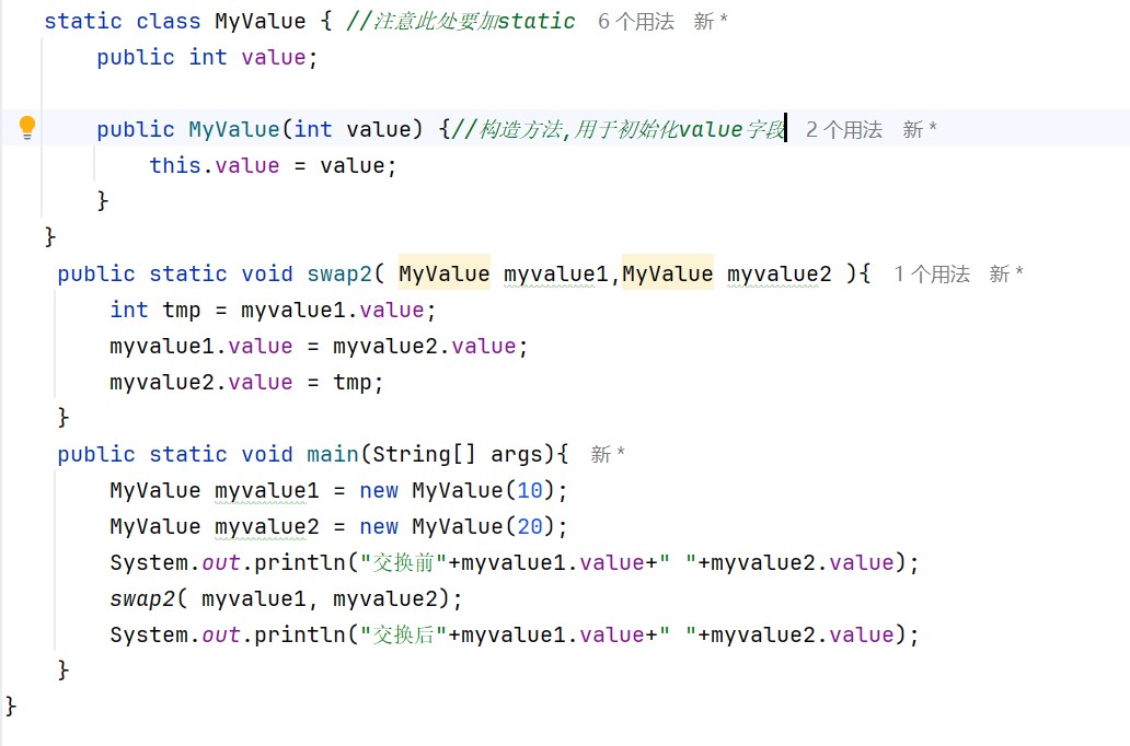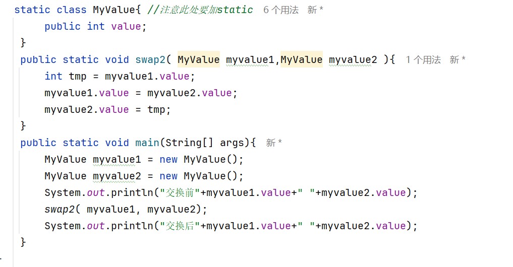 main无法直接调用非静态方法(如swap)或创建非静态内部类(如myvalue)的实例 例如: