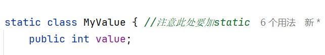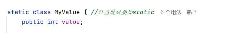 myvalue是定义在另一个类(假设是main类,因为有main方法)里面的内部类。 - 内部类默认是 “依赖外部类对象” 存在的(非静态内部类),它需要先有外部类的实例,才能创建自己的实例。(也就是说,如果把不加static,将这段代码放到外面,这串代码也是正确的)