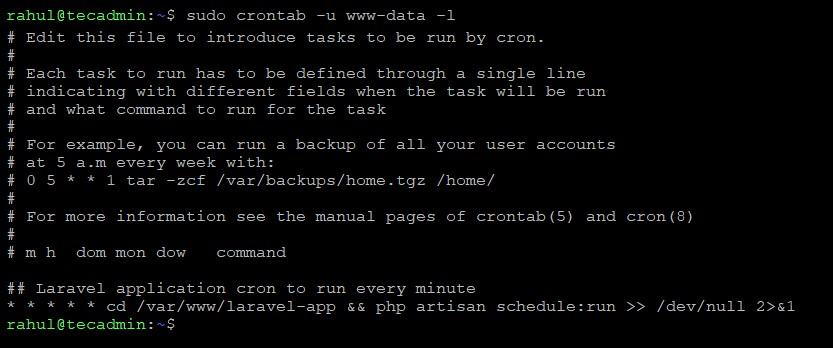 您可以看到,laravel 应用程序的 cron 作业已正确配置为 www-data 用户。