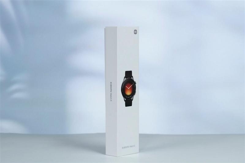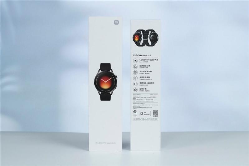 小米手表5的包装延续了小米产品一惯的简洁,全白色的纸盒正面印有小米手表5的产品图像,底部写有浅灰色的“xiaomi watch 5”产品名,右上角有浅灰色的小米logo。