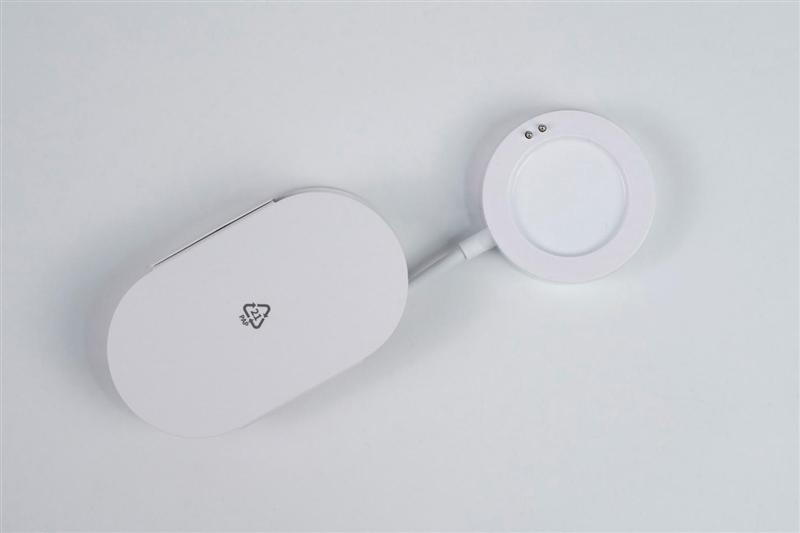 磁吸充电器特写,通过磁吸定位,两个镀金触电自动对齐手表背面的充电触点进行充电,由于手表电池较小,只支持10w充电,所以采用了usb-a的线缆。