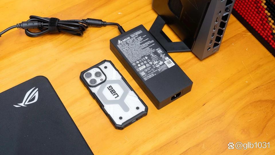 当然为了满足这台性能怪兽的性能,华硕也为其准备了这块330w外置电源适配器。具体尺寸可以参考一下,对比iphone 16 pro。