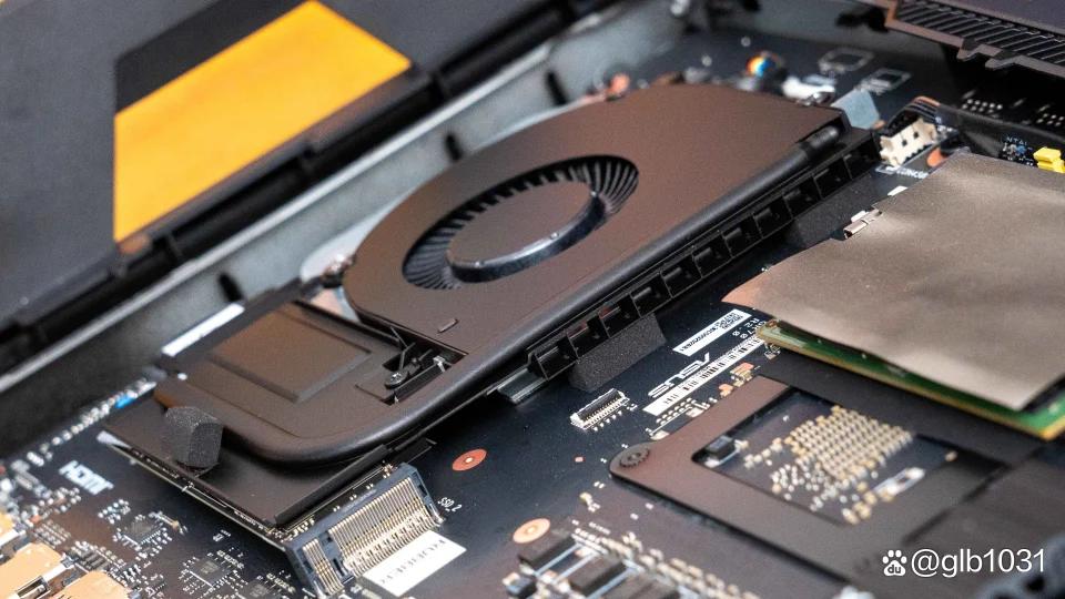 细节上这一侧的风扇似乎是专为m.2 ssd硬盘和内存散热设计的,可以看到这个风扇的散热也覆盖了m.2 ssd硬盘位,专门有一根l型的导热管与风扇出风口连接。