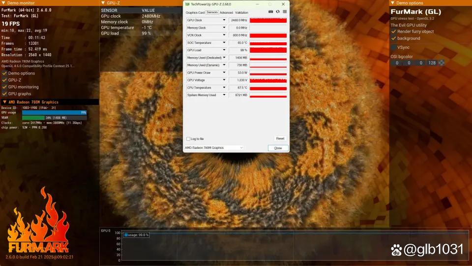 780m核显压力测试下,780m核显频率为2400mhz,功耗53w,温度65℃。