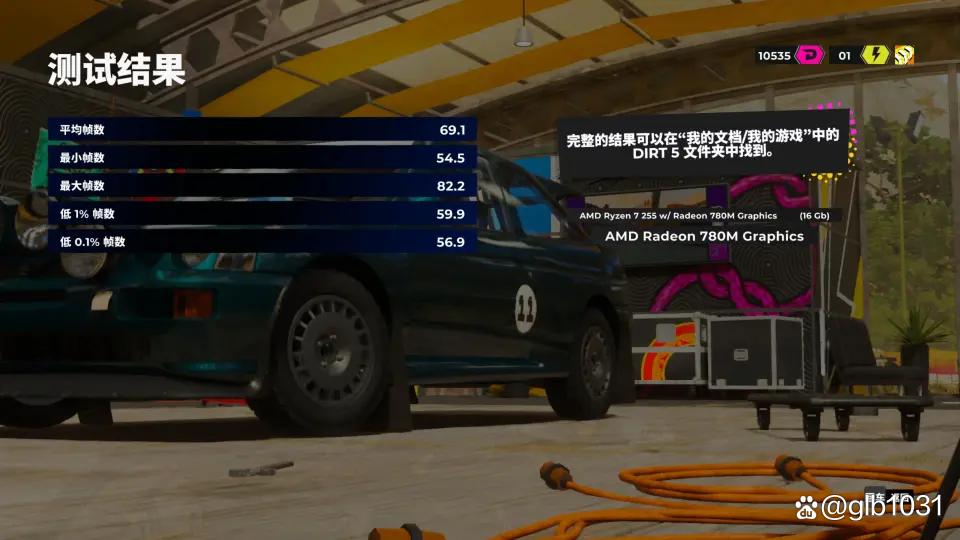「尘埃5」游戏1080p分辨率,预设中等画质下游戏平均帧数69.1 fps,最小帧数54.5 fps。