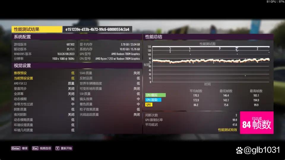 「极速地平线 5」游戏在1080p分辨率,低画质下开启fsr,游戏平均帧:84fps。