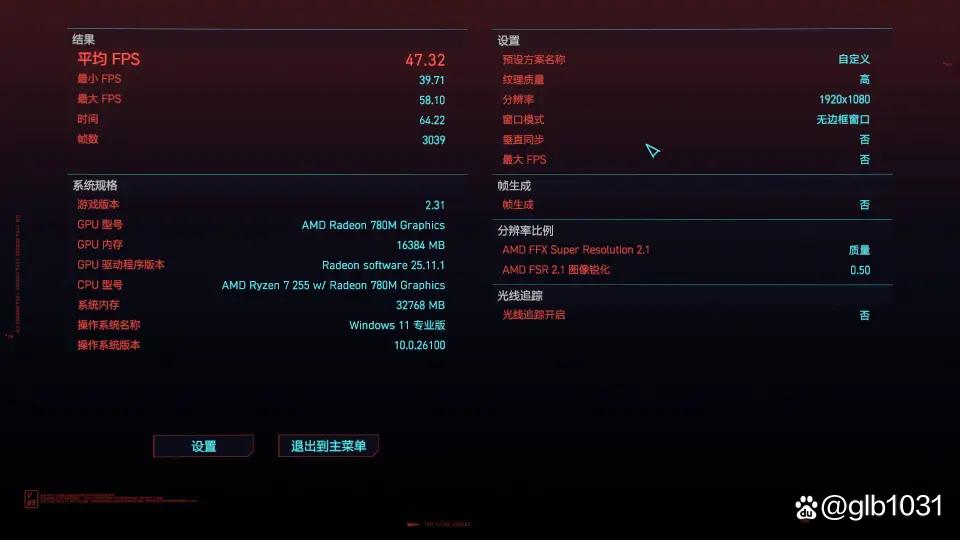 「2077」游戏1080p 分辨率下高画质下未开启光追的情况下,开启fsr 2.1游戏平均帧数达到了47.32 fps,最低帧数39.71 fps。