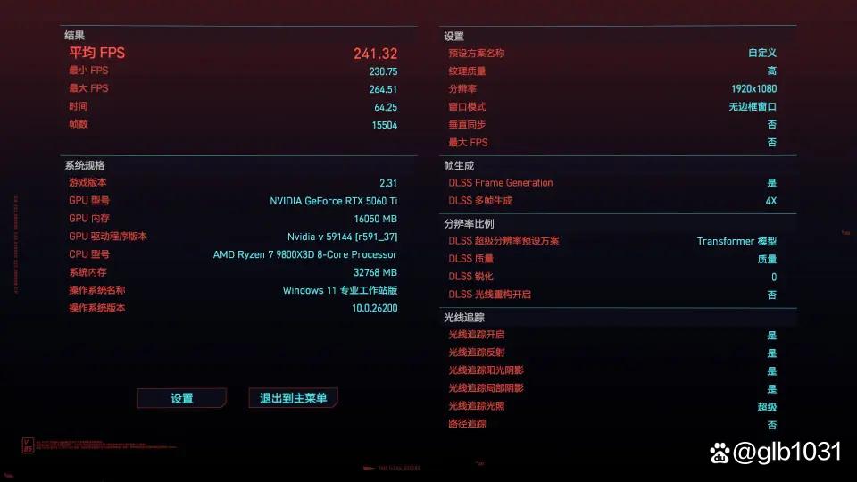 「赛博朋克2077」游戏1080p分辨率下开启光追的情况下,开启dlss 4游戏平均帧数达到了241.32 fps,最低帧数230.75 fps。