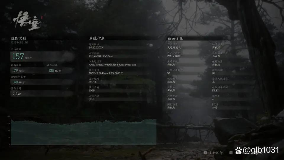 「黑神话:悟空」游戏在1080p分辨率下,开启全景光线追踪超级后超级采样率为50(性能)的情况下,开启dlss 4后游戏平均帧数157 fps,最低帧数135 fps。
