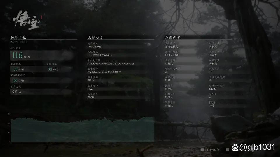 「黑神话:悟空」游戏在1080p分辨率下,开启全景光线追踪超级后超级采样率为75(质量)的情况下,开启dlss 4后游戏平均帧数116 fps,最低帧数98 fps。
