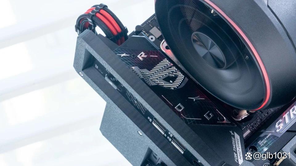 两侧采用正反扇叶设计,均为直径120mm风扇设计。5扇叶+环装灯带效果再点亮之后真的非常好看的风冷散热。而且细节上,两侧正逆风扇均设计了加固环设计,在增加风扇稳定性同时还增加了风扇强度。