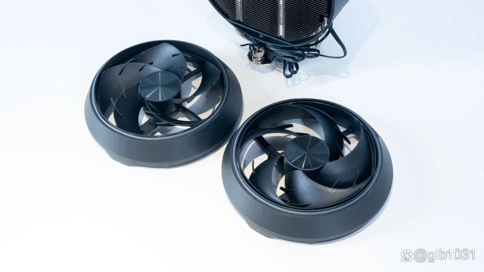 圆形的散热主体在风冷产品中真的是非常少见的造型了,两侧设计了两把磁吸风扇设计。正反叶设计,5片扇叶设计也犹如飞机发动机造型。