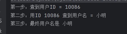 system.out.println("第二步:用id " + userid + " 查到用户名 = 小明");