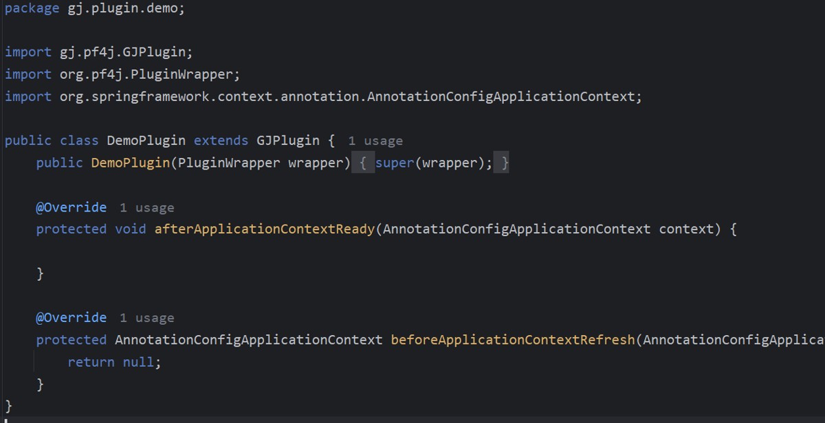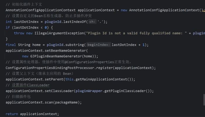 插件开发者可重写beforeapplicationcontextrefresh和afterapplicationcontextready,熟悉.net core开发的伙伴们应该能猜到等同于configureservices和configure方法,在before方法里可自定义手动注册相关bean(当然常见的component和bean等注解会自动注册),而after则是上下文刷新完成后可做业务上的初始化工作