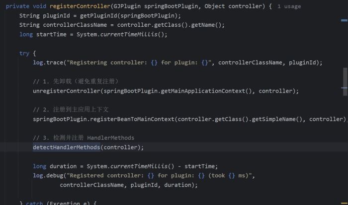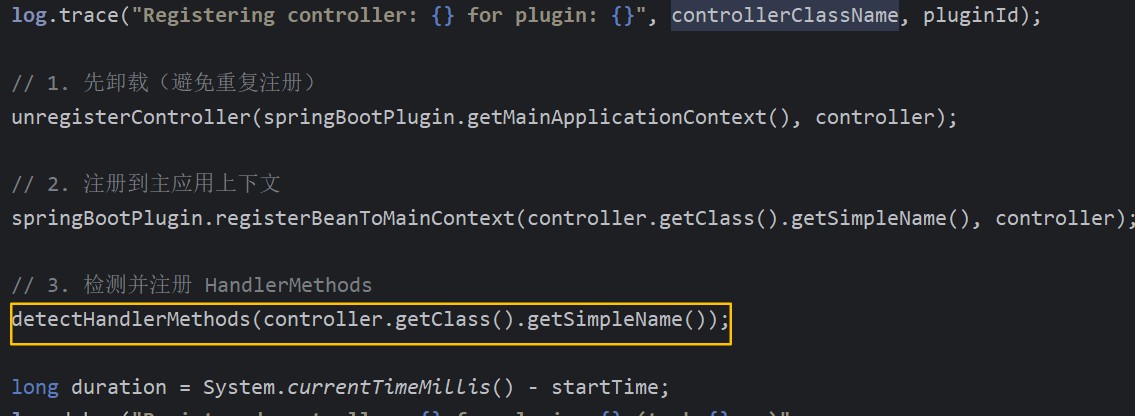 上述严格判断插件控制器方法的bean到底是不是属于对应的控制器,于是我们回过头去看我们动态注册控制器的bean和将控制器的方法注册到请求处理映射的逻辑,如下再重点标识一下,以免小伙伴们忘记了