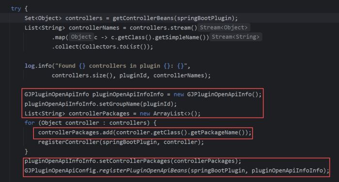 }在上述我们遍历控制器列表动态注册控制器时,此时调用上述封装注册插件的groupedopenapi,代码如下: