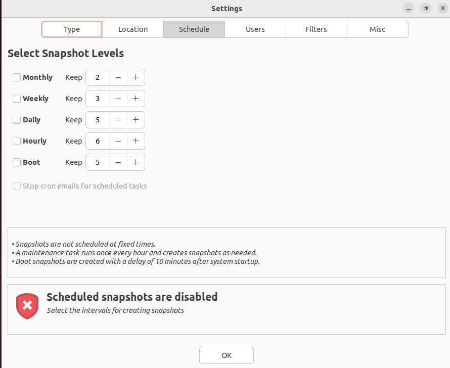 - 默认情况下,timeshift 不会备份用户数据(如文档、图片、下载等),只备份系统目录等),以避免占用过多空间并专注于系统恢复。