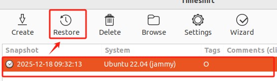 # 备份 sudo timeshift --create --comments "快照名" #设置备份目标目录 #我们可以通过配置 /etc/timeshift/timeshift.json 中的 backup_device_uuid 来确定备份位置。 #通过如下命令可以查看磁盘 uuid : blkid cat /etc/fstab # 查看。查看已存在的快照 sudo timeshift --list # 删除快照 sudo timeshift --delete --snapshot '2025-12-18_10-43-33' # 恢复。选择上面已存在的其中一个快照进行恢复,如:快照'2025-12-18_09-32-13'。 # --skip-grub 表示不恢复 grub 引导配置(通常推荐,除非你明确知道引导也坏了)。 sudo timeshift --restore --snapshot '2025-12-18_09-32-13' --skip-grub
