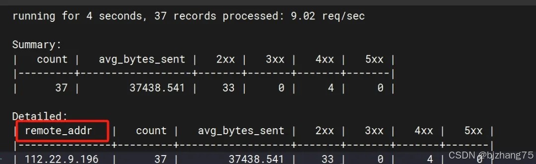 - -g:group by分组字段,默认按request_path字段分组。如按客户端ip分组:ngxtop -c /usr/local/nginx/conf/nginx.conf -t 1 -g remote_addr