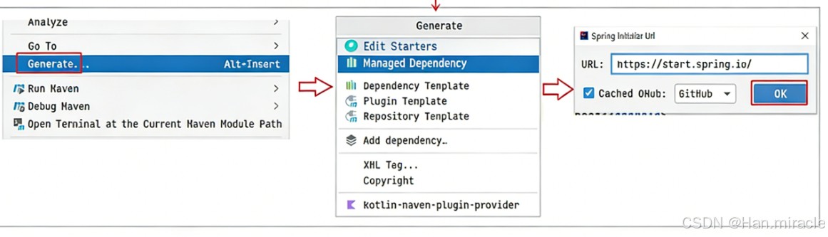 2. 在pom.xml⽂件中,单击右键,选择generate,操作如下图所示