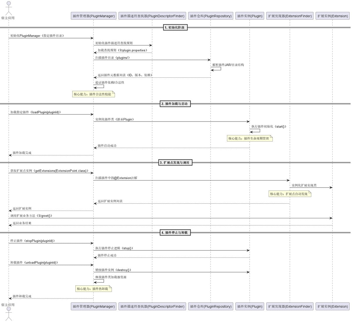pf4j官方有基本介绍以及对整个框架的架构等等,我们不再浪费口舌。如下是通过ai总结pf4j的能力所导出的时序图,基本上算是那么回事,给不了解pf4j能力的童鞋留个基本印象