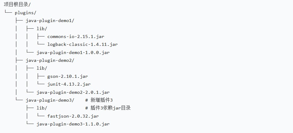 我们设计的具体插件有2个层级,将插件jar包去除版本号的名称作为插件目录,其目录下放插件jar包,同时还有个lib目录,该lib目录用于存放插件的依赖,此依赖既可来源于插件引入独立依赖的mvn仓库包,也可来源于与外部对接时的私有包(不存在于mvn仓库)。 很显然,pf4j不支持(一句话概括:pf4j没有插件目录层级之分,所有插件jar包统一放到插件目录下以及依赖也统一放到插件目录下的lib目录下,在此不再做进一步的源码讲解),我们重写其方法实现