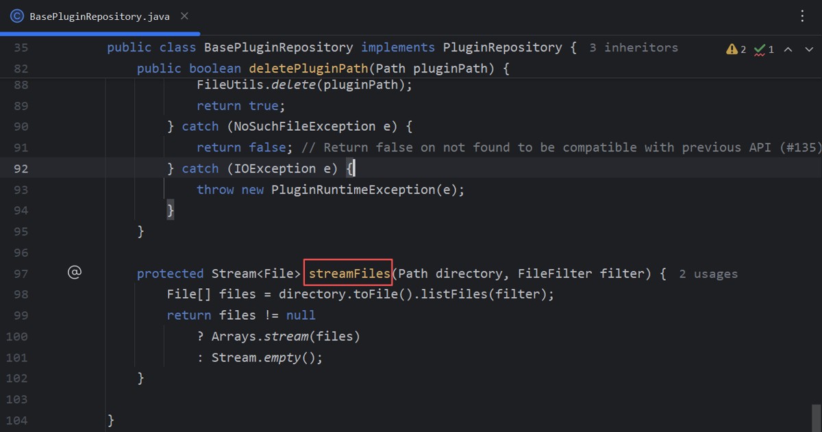如上basepluginrepository为pf4j提供的基本实现,同时pf4j进一步提供jarpluginrepository继承basepluginrepository,仅仅只是作为构造函数传递插件目录路径,所以我们可以自定义继jarpluginrepository,重写上述streamfiles方法即可,该方法有2个参数,第一个则是插件目录路径,第二个则是文件类型过滤(jar)