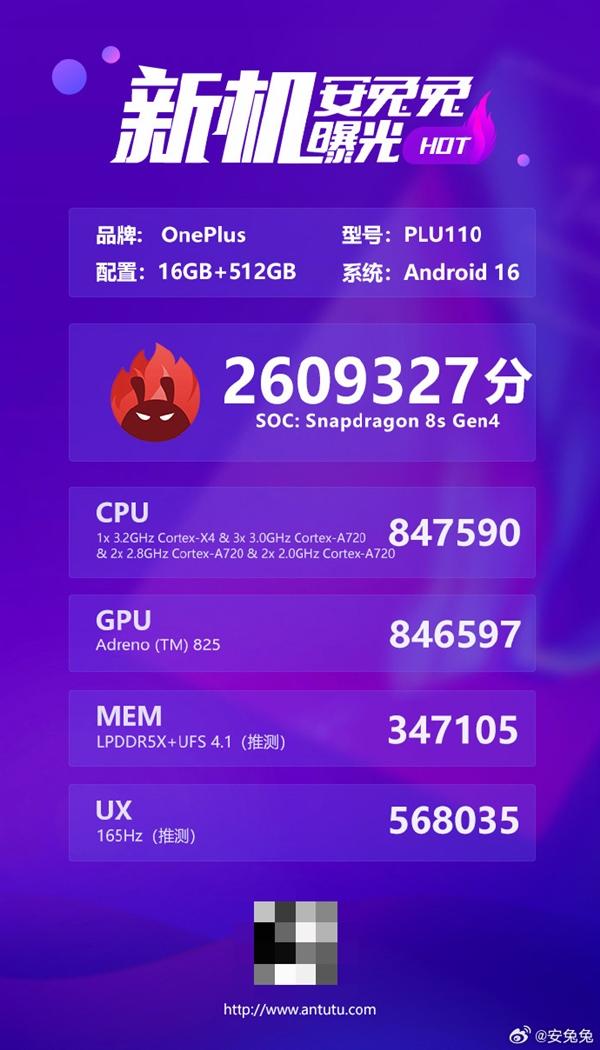 骁龙8系旗舰+9000mAh超大电池! 一加Turbo 6配置和安兔兔跑分曝光