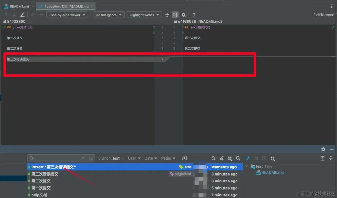 git自动产生一个revert记录,然后我们会看到git自动将我第三次错误提交代码回退了,这个其实就相当于git帮我们手动回退了代码。