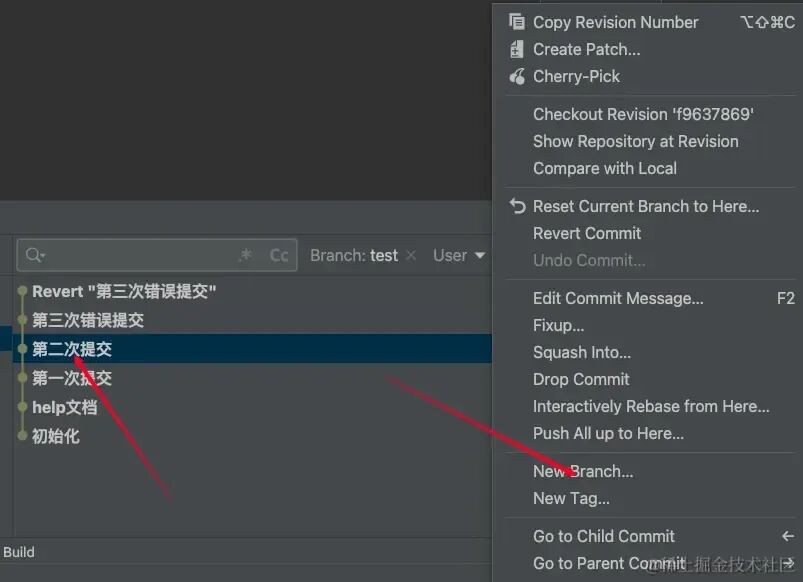 同样的,我第三次提交了错误代码,并且已经push到远程分支。想要撤回这部分代码,只需要右键点击错误提交记录