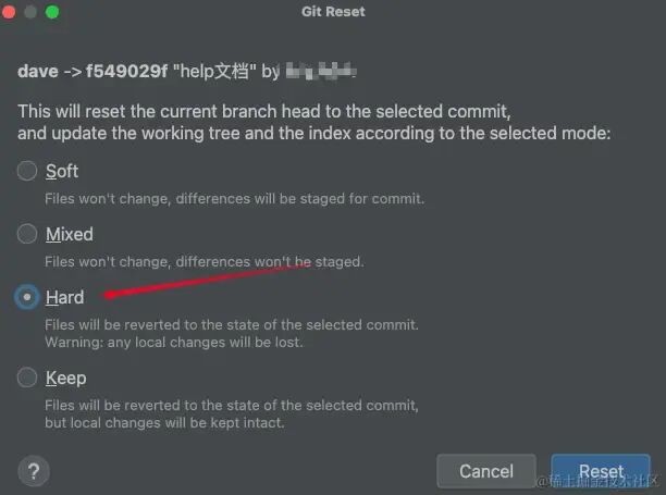 - keep :任何本地更改都将丢失,文件将恢复到所选提交的状态,但本地更改将保持不变。你已经提交了,然后你又在本地更改了,如果你选keep,那么提交的内容会丢失,你提交后又本地修改未提交的内容不会丢失。