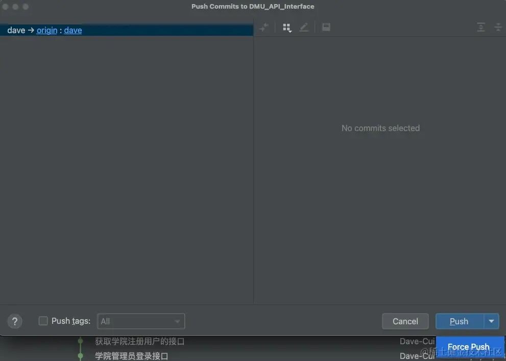 然后,之前错误提交的commit就在本地给干掉了。但是远程仓库中的提交还是原来的样子,你要把目前状态同步到远程仓库。也就是需要把那几个commit删除的操作push过去。