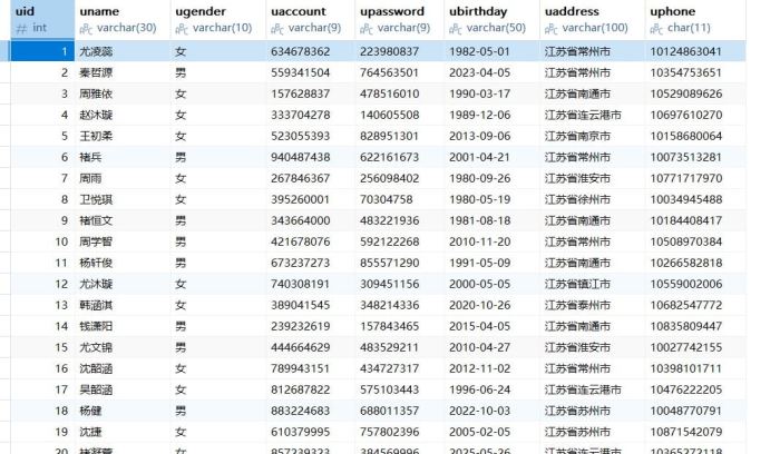 insert into t_users (uname, ugender, uaccount, upassword, ubirthday, uaddress, uphone)
