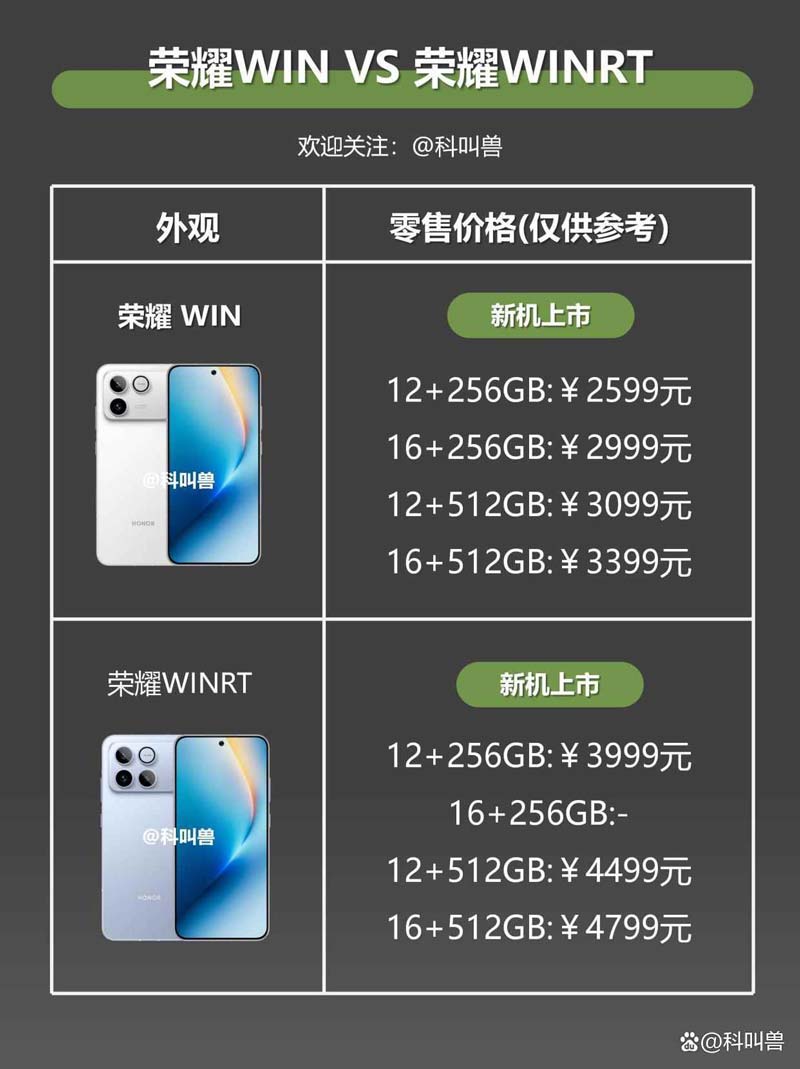 荣耀winrt的价格相当吸引人,其最低配置版本仅需2599元,非常适合作为备用机使用。若作为主力机考虑,12+512gb版本仅需3099元,性价比极高。而荣耀win的价格则起步于4000元以上,其竞争对手可能包括iqoo15和一加15等高端机型,其12+512gb版本的价格已接近4500元。