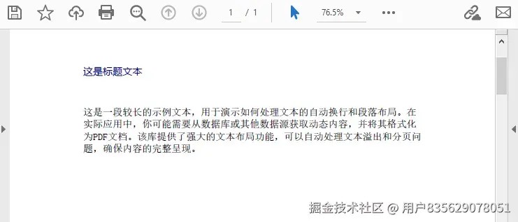 string longtext = "这是一段较长的示例文本,用于演示如何处理文本的自动换行和段落布局。在实际应用中,你可能需要从数据库或其他数据源获取动态内容,并将其格式化为pdf文档。该库提供了强大的文本布局功能,可以自动处理文本溢出和分页问题,确保内容的完整呈现。";