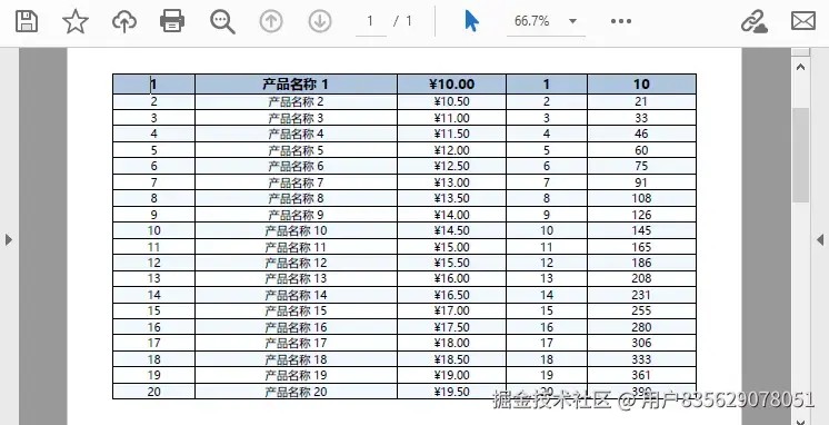 表格是展示结构化数据的最佳方式。该库提供了强大的表格组件,支持复杂的表格布局,包括表头、数据行、单元格合并、边框样式、行高列宽调整以及自动分页。