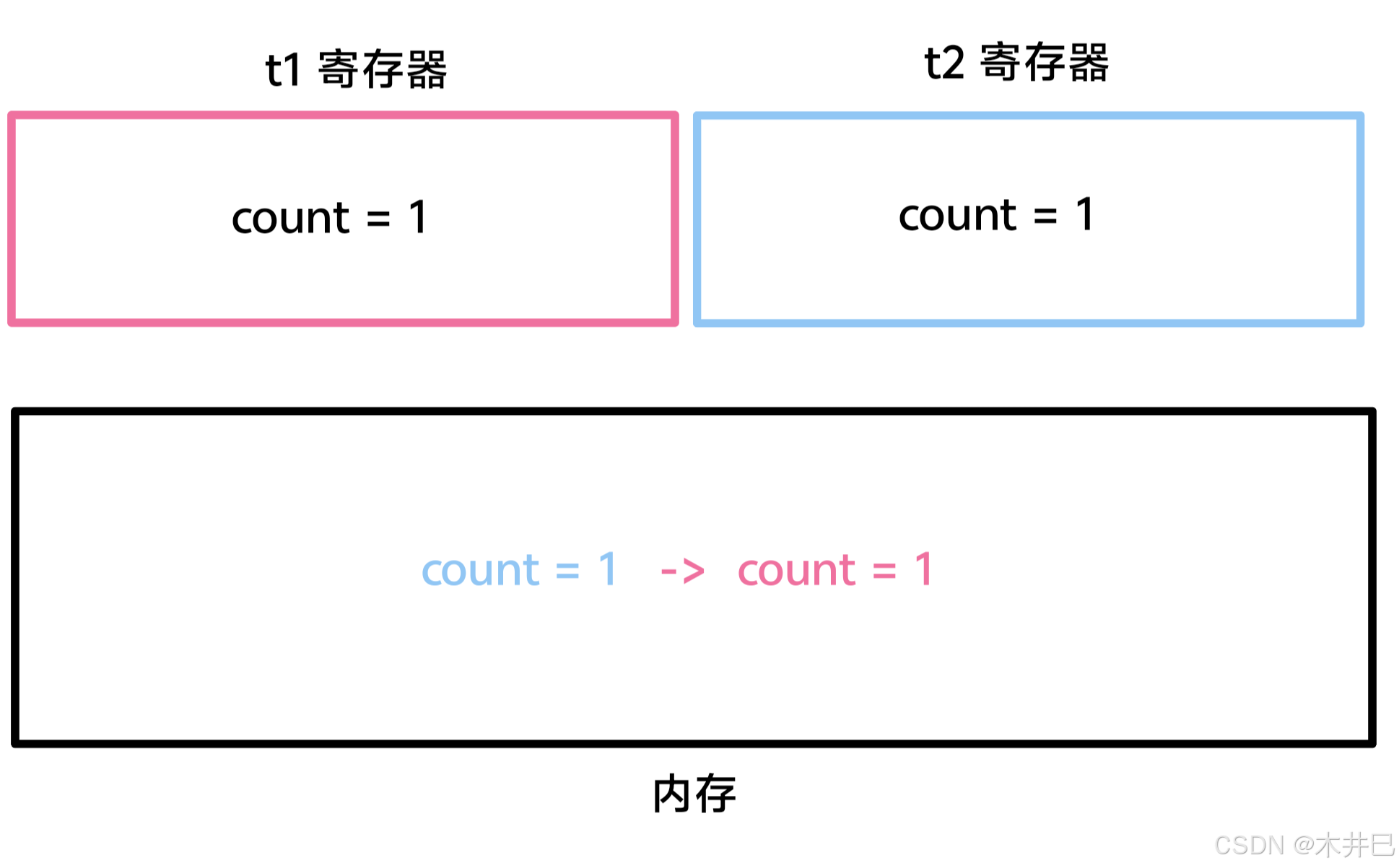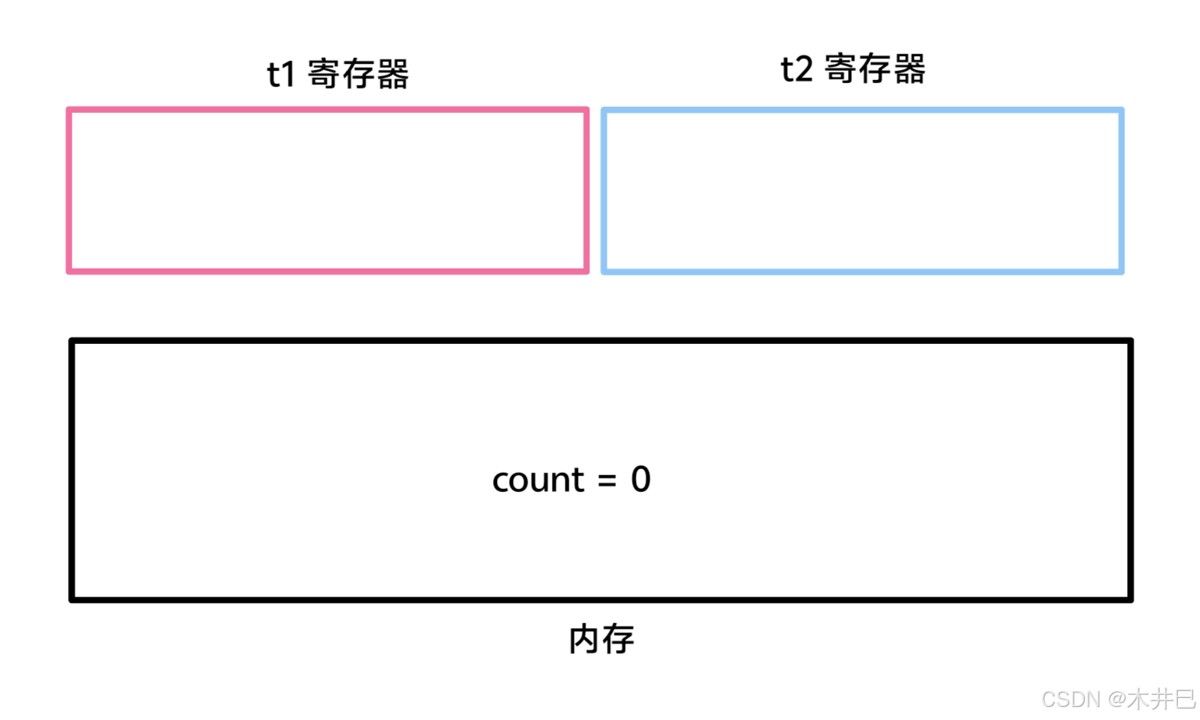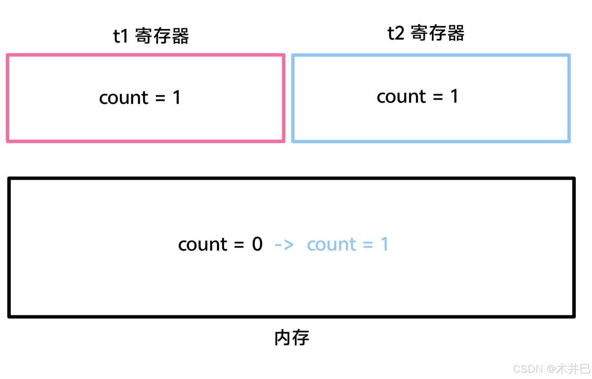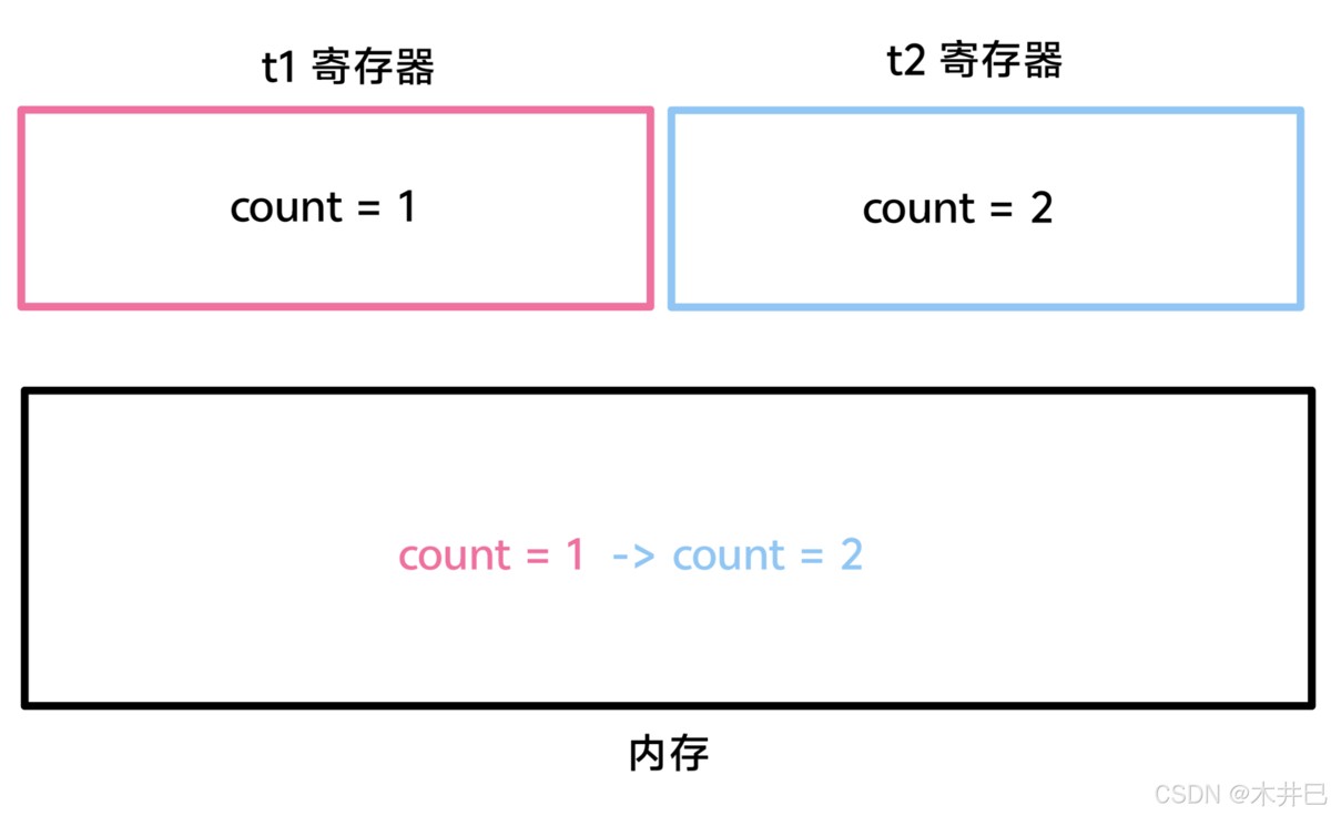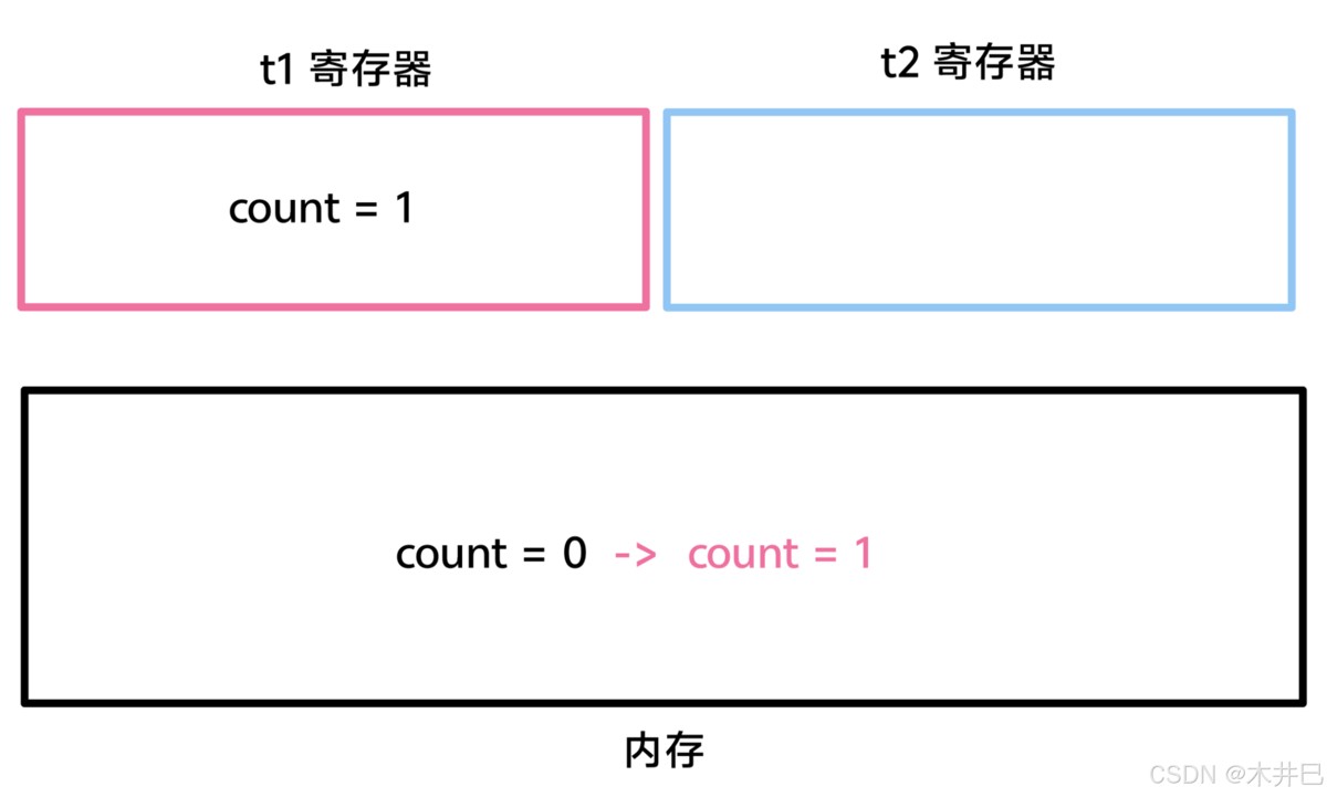 2. t1 线程和 t2 线程分别执行一次“count++”语句,期望的结果是“count = 2”,其过程如下:
