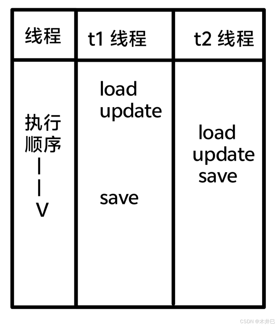 当线程执行“count ++”时,总共分三个步骤:load、update、save,由于线程调度的随机性/抢占式执行,可能会出现以下情况(可能出现的情况有很多种,这里只是其中一种):