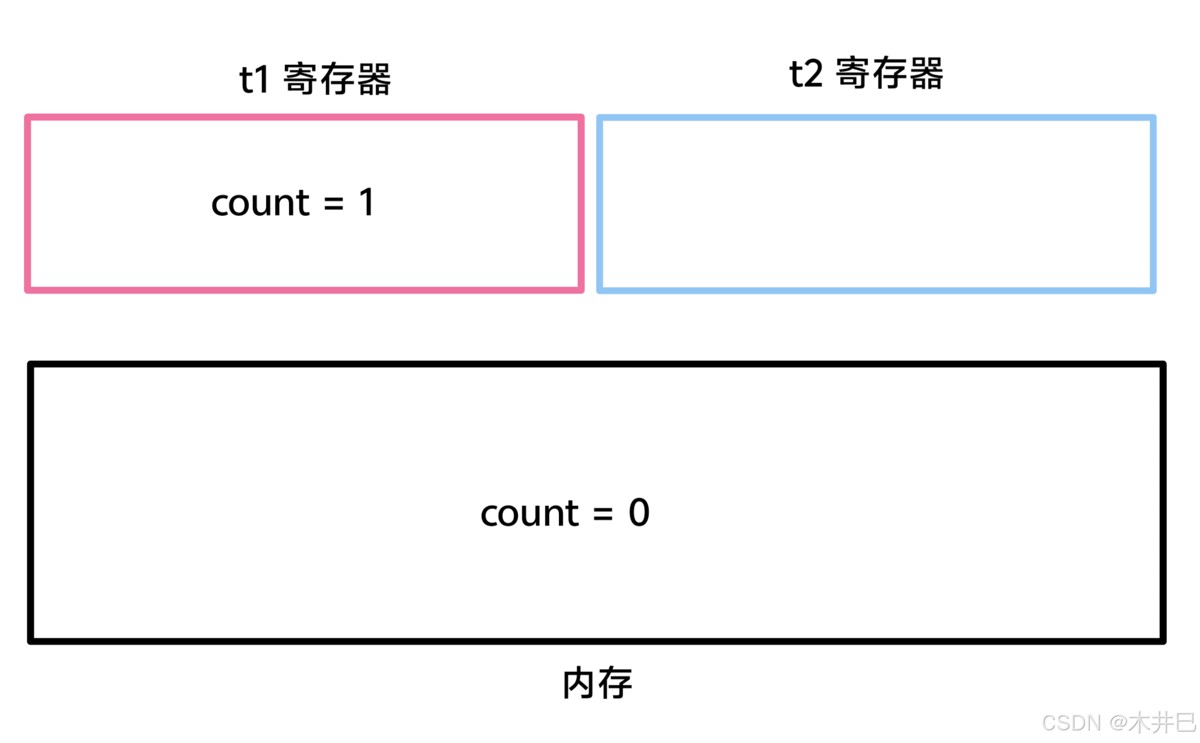 这时候 t1 正在执行“count ++”这条语句,执行了“load 和 update”指令后,t1 的工作内存(寄存器)存着更新后的值,但是还未被写回内存中: