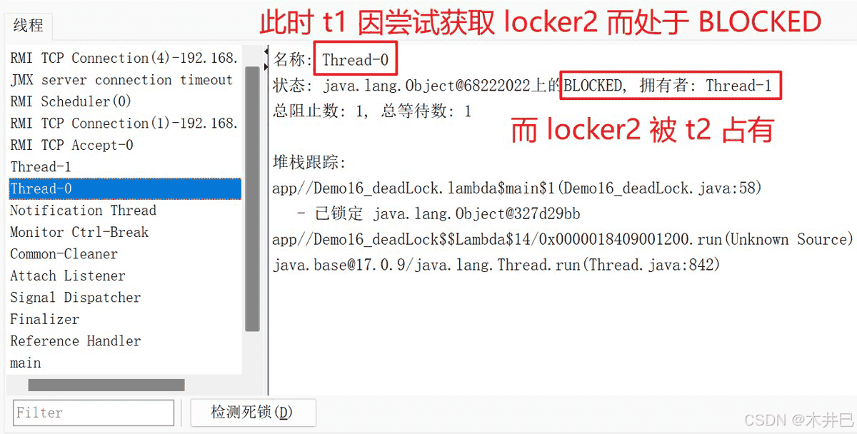 // 因 t1 先获取到 locker1 ,t2 此时处于阻塞状态 blocked