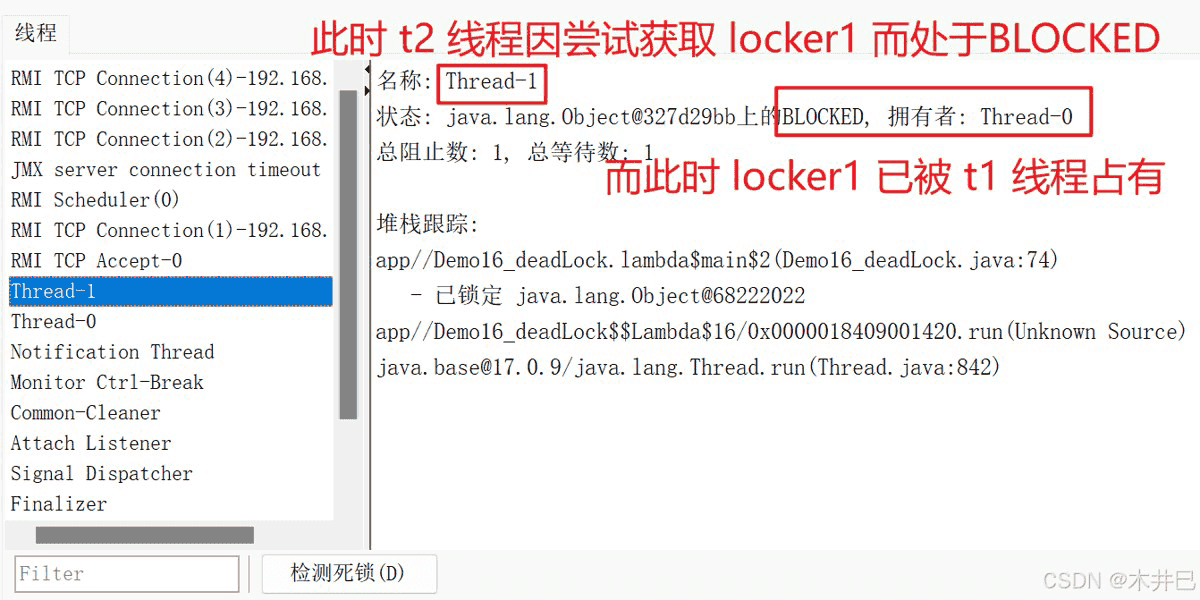 // 此时 t2 因 locker1 被 t1 获取而处于阻塞状态 blocked
