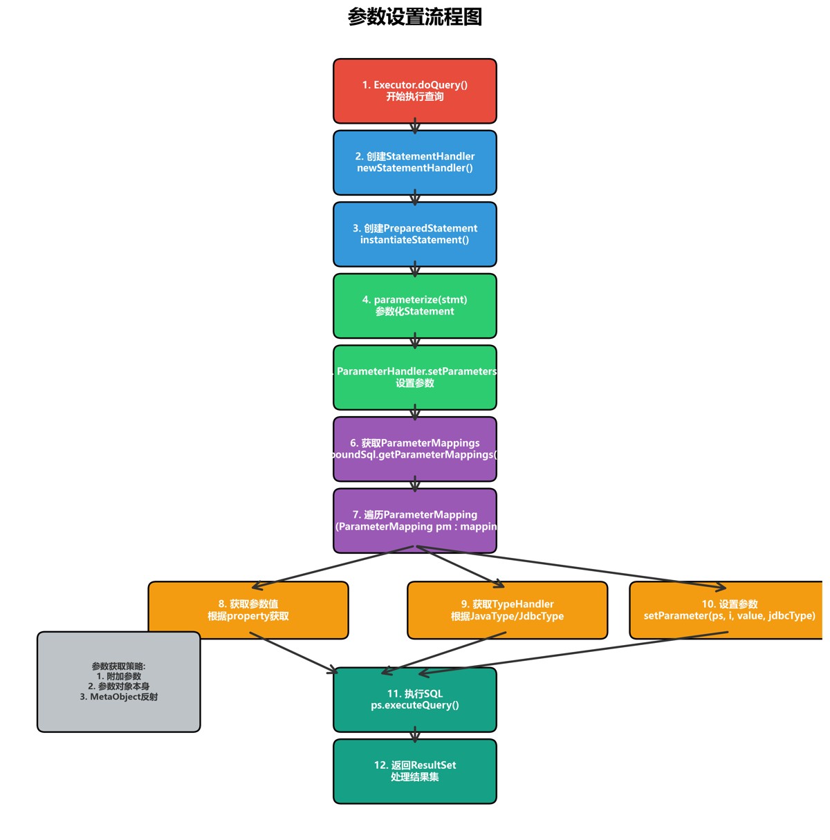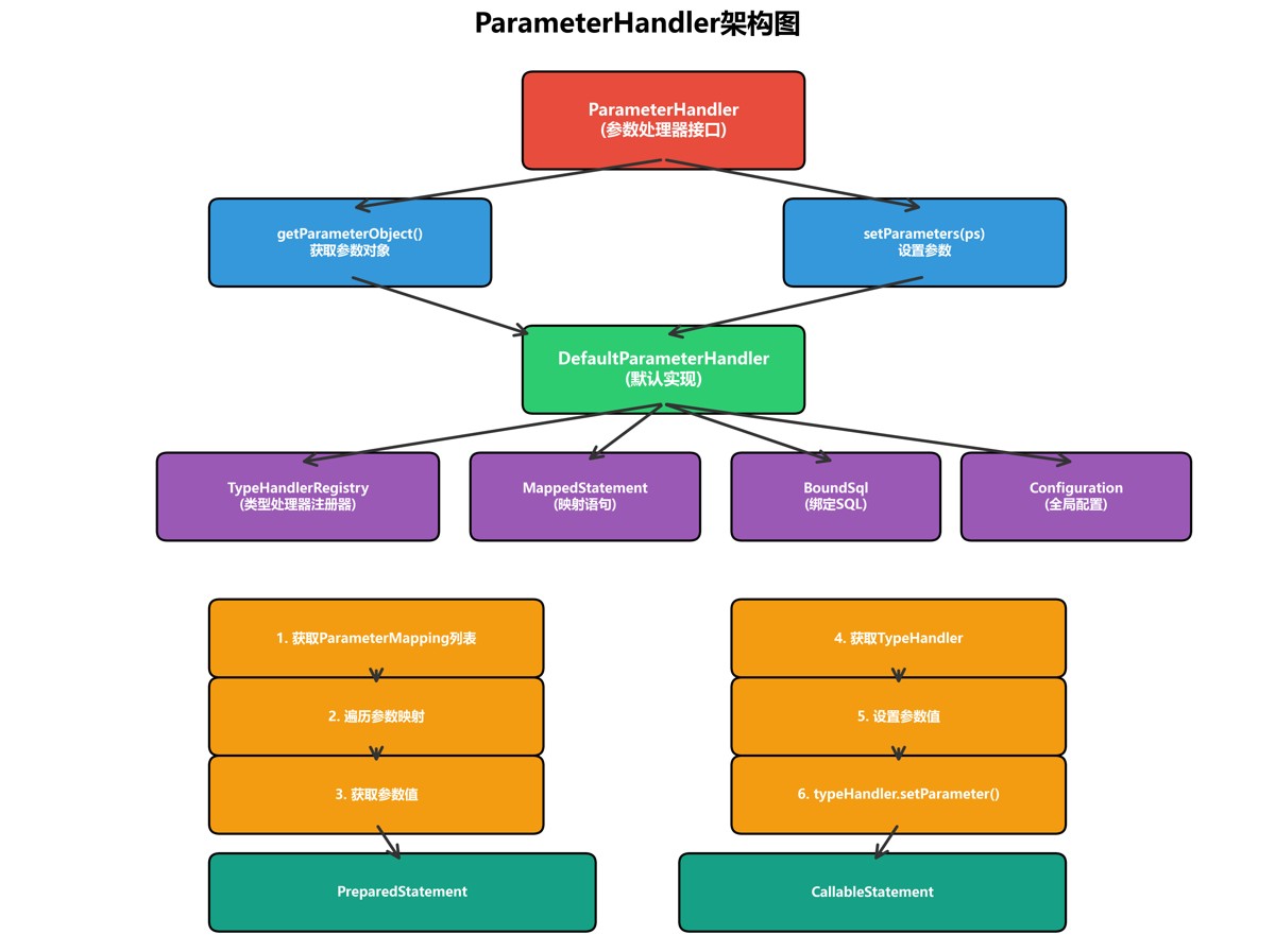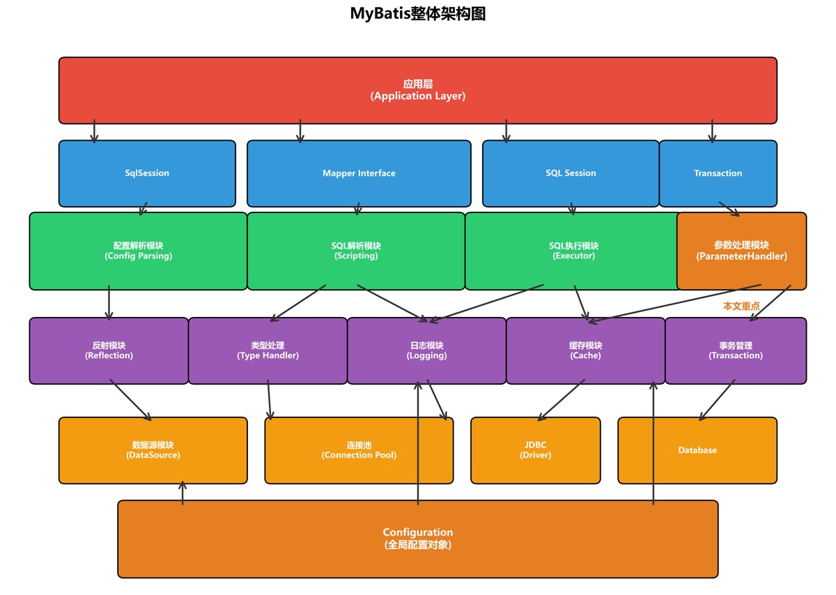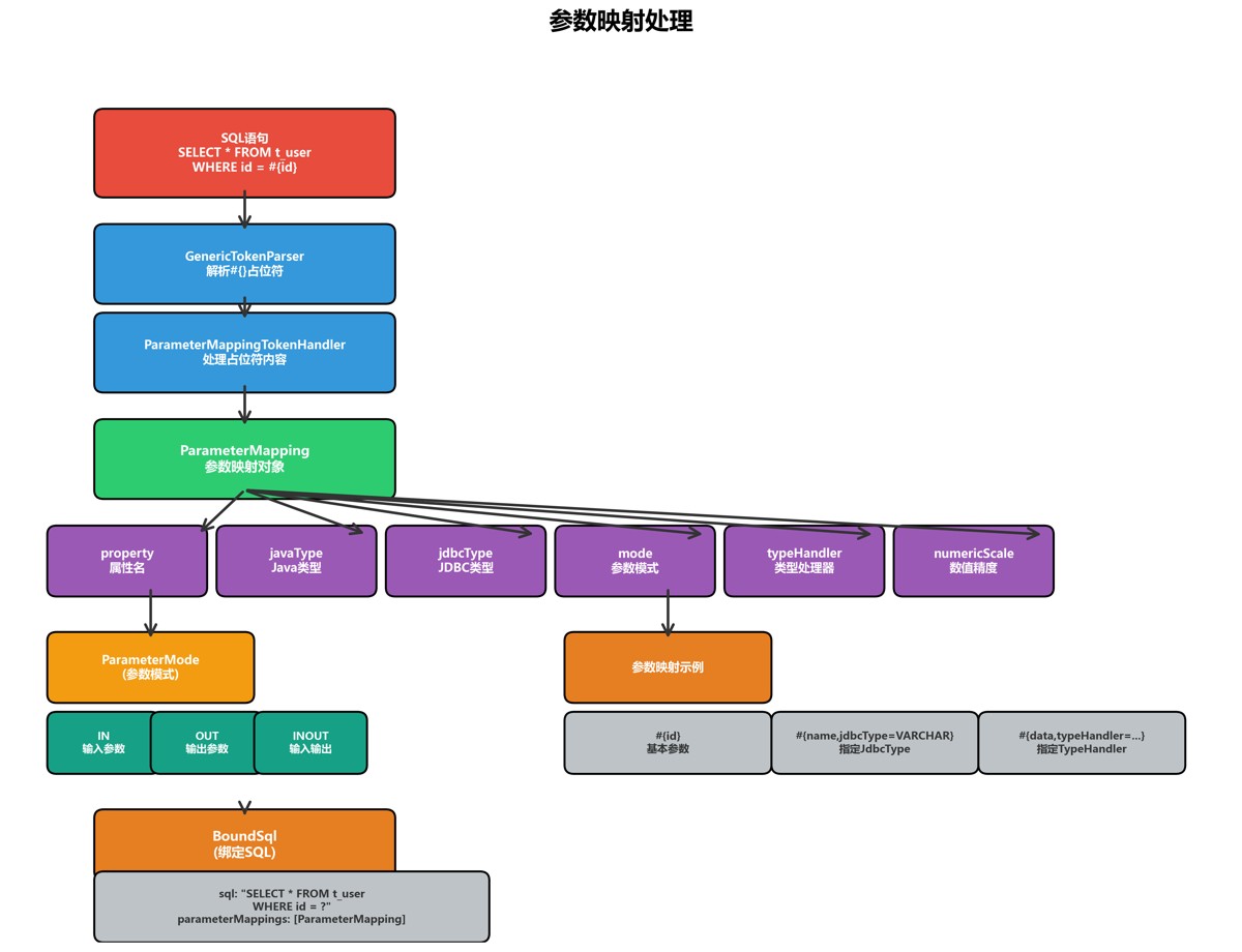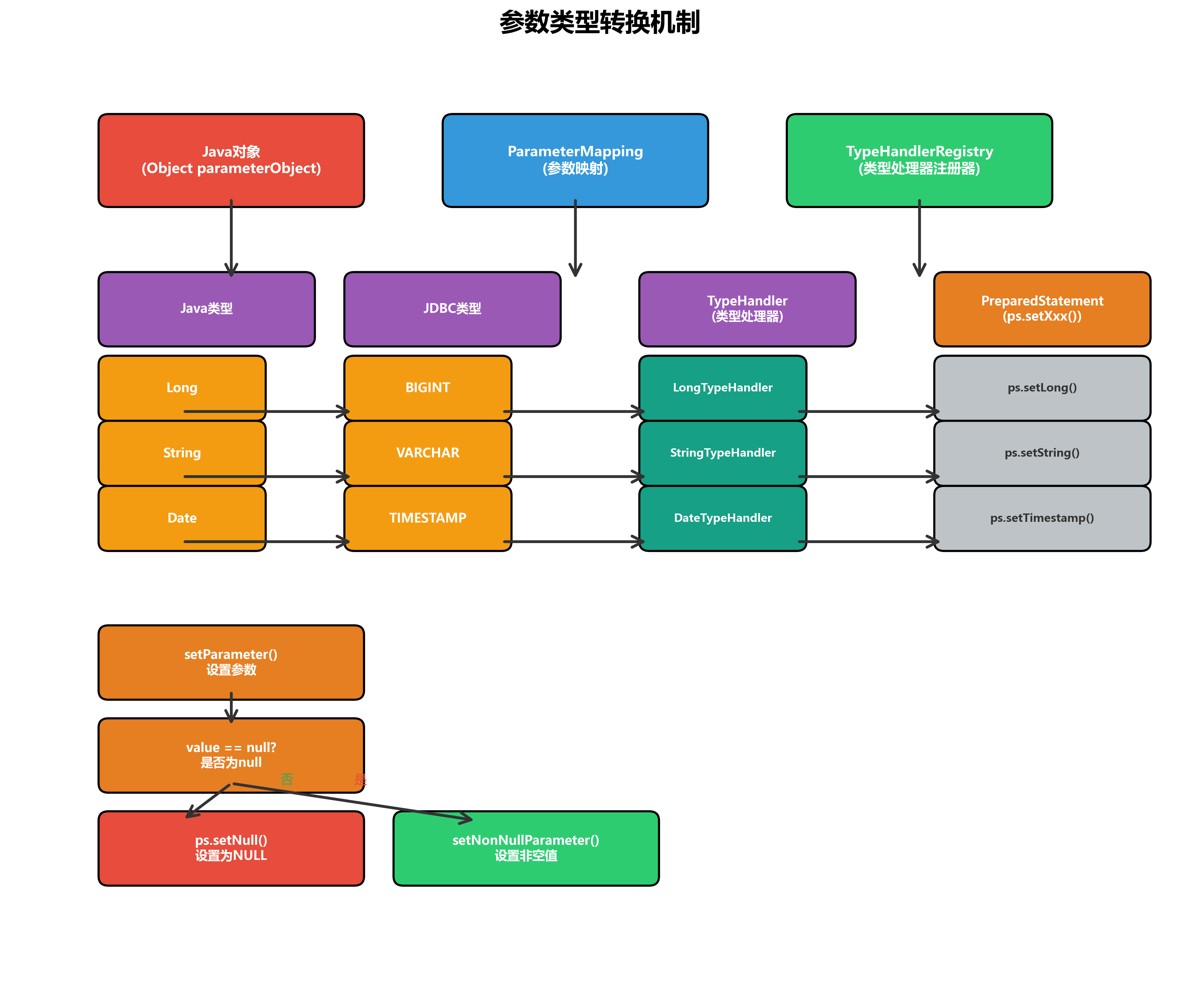 从上图可以看出,mybatis采用了分层架构设计,而参数处理模块位于核心处理层,是sql执行过程中的关键环节。它负责将java对象参数转换为jdbc能够识别的参数类型,并设置到preparedstatement中。