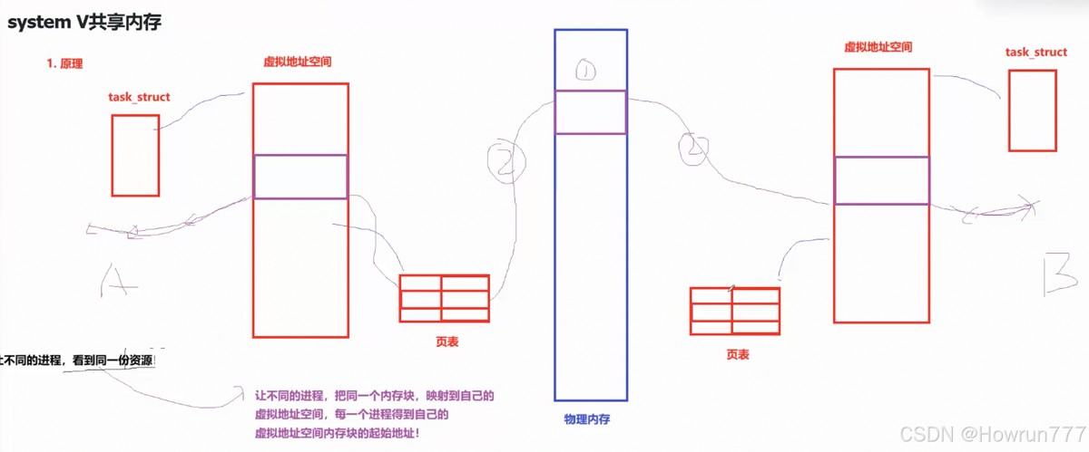 shmget(),内核在物理内存中分配一块连续区域,初始化shmid_ds; - 映射到进程空间:进程调用